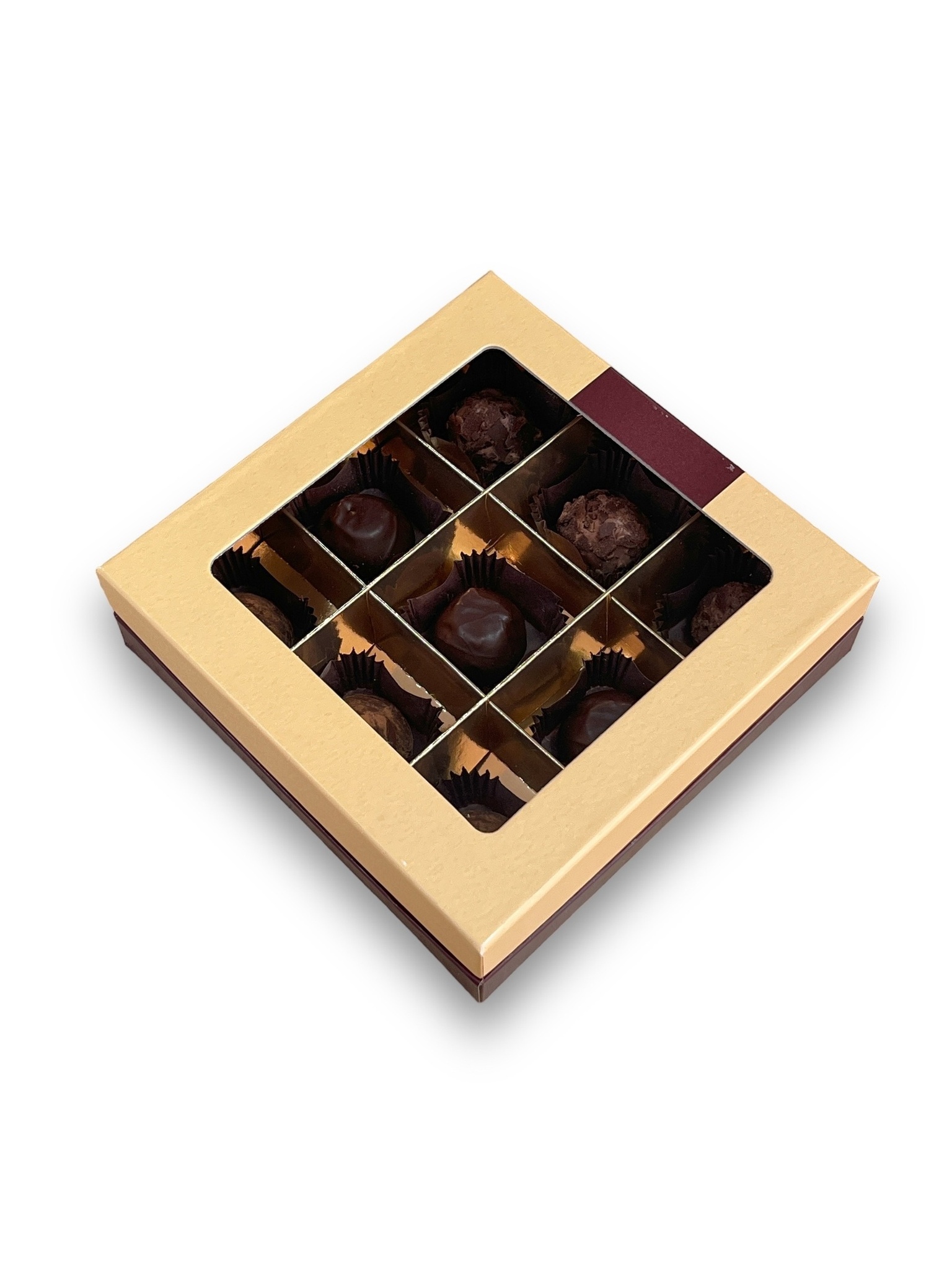 Коробка для конфет ПРЕМИУМ с большим окном 160*160*45 (9) (шоколадно-бежевая/золото)
