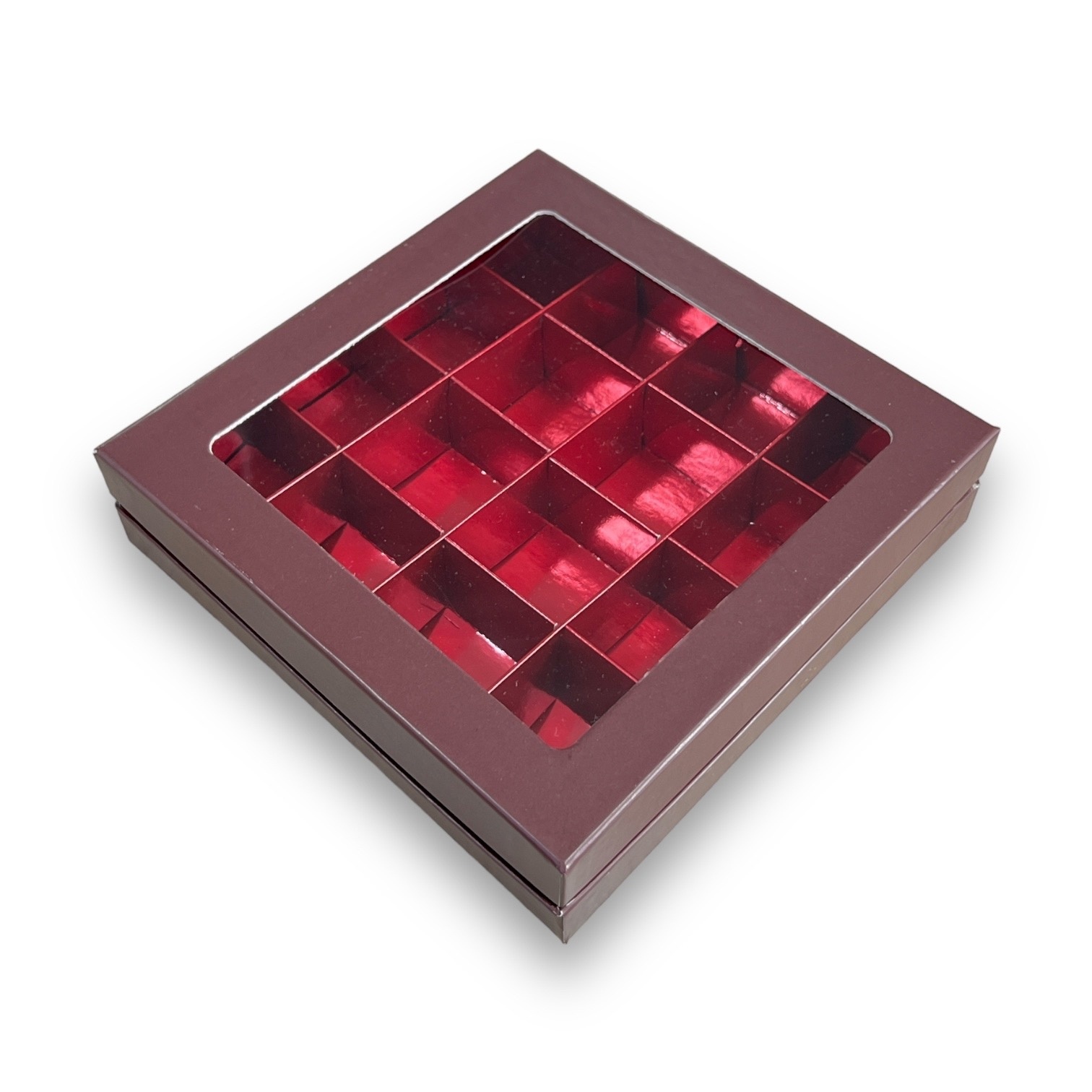 Коробка для конфет ПРЕМИУМ с большим окном 180*180*45 см (16) (шоколад/красная глянцевая)